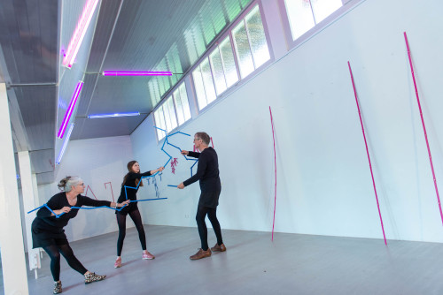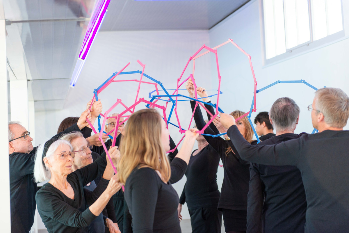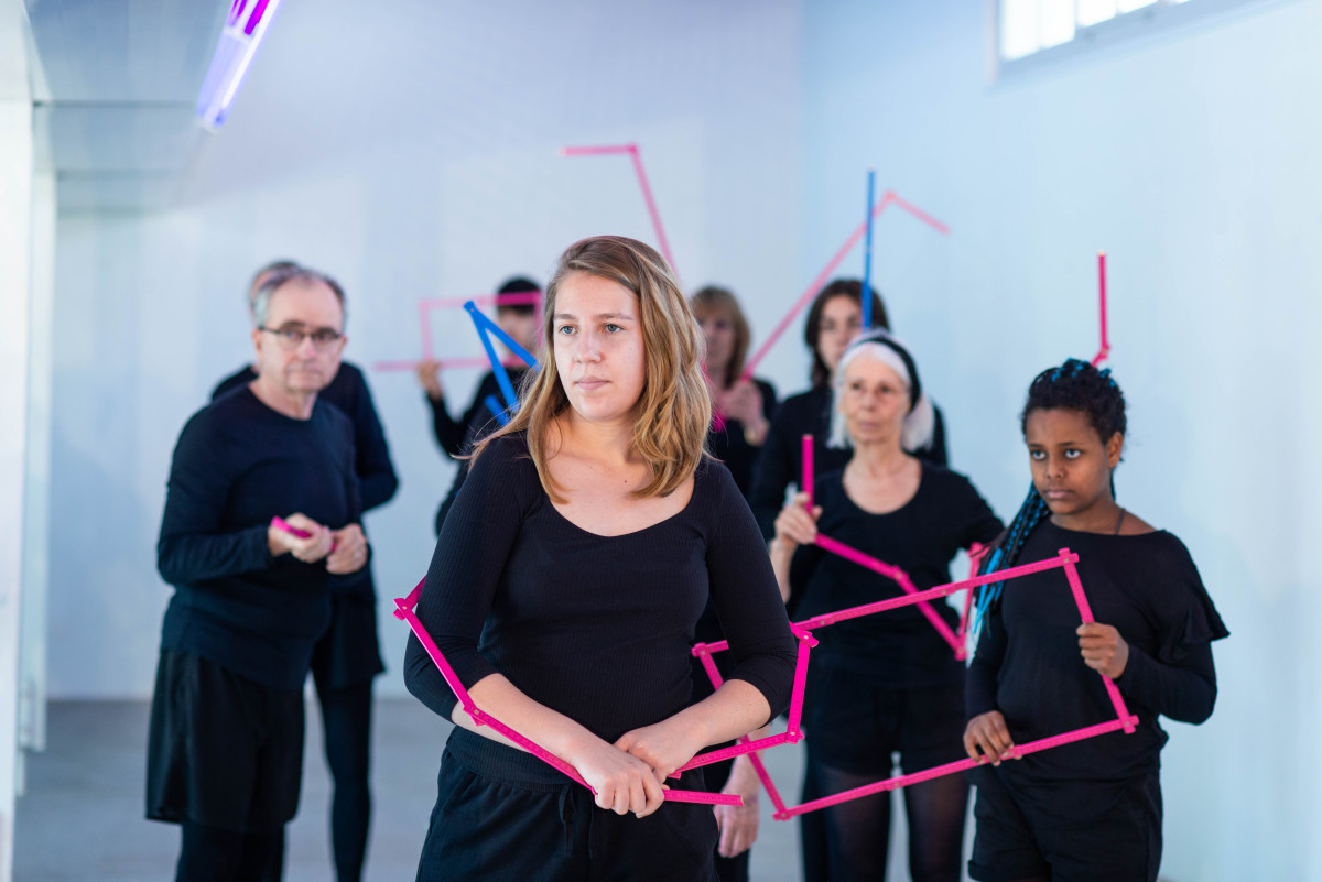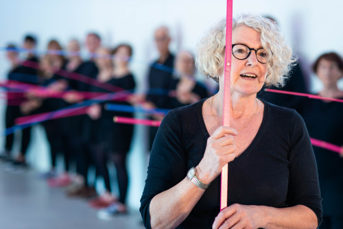 In der Performance Doghearts vermessen 18 Performer*innen mit ihren Körpern, 18 Meterstäben und vielen offenen Fragen ans Publikum, was Menschsein für sie ausmacht und welche Utopien und Dystopien eines zukünftigen Menschseins sie imaginieren: “Werden wir uns in künstliche Intelligenz statt in echte Menschen verlieben? Was werden wir im Auto machen, wenn wir nicht mehr selber fahren müssen? Und wenn wir mit Implantaten Wissen und Gedanken übertragen können - werden wir dann insgesamt mehr wissen als zuvor?”